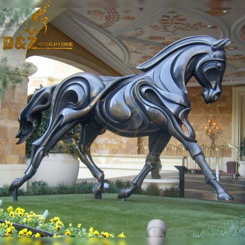 This is an abstract horse garden sculpture with a modern design. The design of this horse sculpture is very unique, with a unique rotating pattern on the body, which is very modern and metallic. It perfectly combines modern design with horse sculpture, very beautiful. In addition, we also have various bronze horse sculptures, for example, bronze running horse sculptures, bronze jumping horse sculptures, bronze horse head sculptures, etc. We also support customization, as long as you provide your ideas.